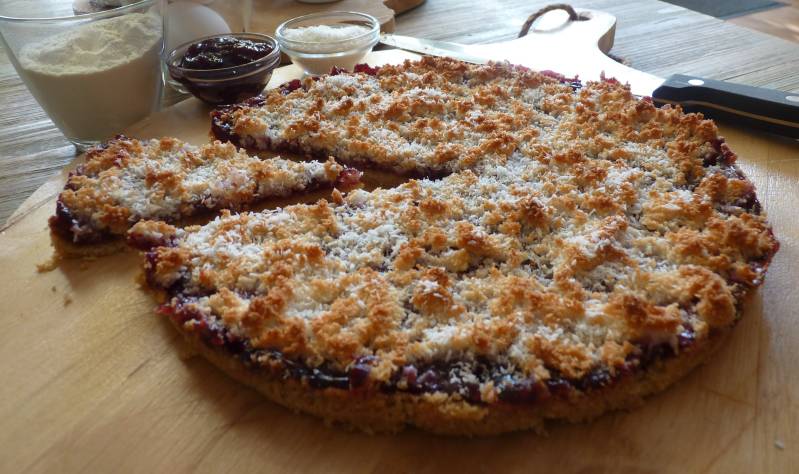 Koek gevuld met bosvruchtenjam, daarbovenop kruimelige kokos.